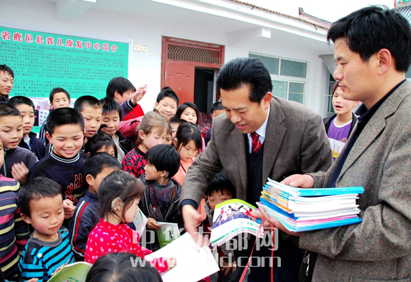 連祥工(右一)與愛心人士一起看望留守兒童。(資料圖片)