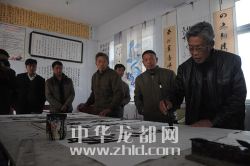 ????作為距離太康縣城最遠(yuǎn)的一個(gè)邊界鄉(xiāng)鎮(zhèn),轉(zhuǎn)樓鄉(xiāng)的文化活動(dòng)開(kāi)展得有聲有色。該鄉(xiāng)依托文化站,成立了在鄉(xiāng)一級(jí)少見(jiàn)的文聯(lián),下設(shè)書(shū)法家協(xié)會(huì)、腰鼓協(xié)會(huì)、嗩吶協(xié)會(huì)等。我們?cè)谵D(zhuǎn)樓鄉(xiāng)政府采訪(fǎng)時(shí),正碰上書(shū)法家協(xié)會(huì)20多名會(huì)員在一起切磋書(shū)藝。今年74歲的許家榮是鄉(xiāng)書(shū)法家協(xié)會(huì)主席,也是《周口晚報(bào)》的老讀者,看到我們到來(lái),老人興之所至,當(dāng)場(chǎng)揮毫潑墨,為本報(bào)題寫(xiě)了“周口邊界行接地氣有人氣”的條幅。據(jù)了解,每逢春節(jié),書(shū)法家協(xié)會(huì)會(huì)員都會(huì)走村串戶(hù),為村民義務(wù)書(shū)寫(xiě)春聯(lián)。