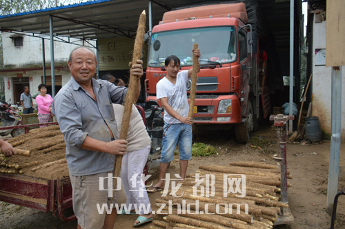 ??? 帶領(lǐng)家人到槐山藥行銷售自家槐山藥的老大爺,滿臉笑容地展示他收獲的長(zhǎng)度近1米的槐山藥。
