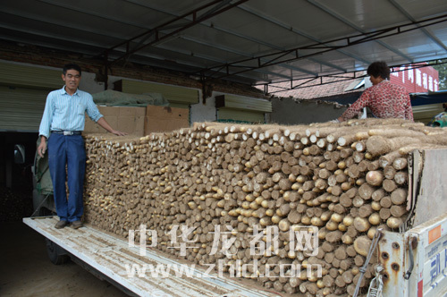 ??? 槐山藥經(jīng)紀(jì)人李勝利在自己的貨車上查看槐山藥裝車情況,據(jù)他介紹,他每年要向外地銷售近5000噸槐山藥。