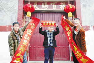 ????④ 近日,扶溝縣韭園鎮(zhèn)灣趙行政村家家戶戶張燈結彩喜迎新年,盼望羊年五谷豐登。圖為該村農民趙晨潔與家人一起展示新買的春聯(lián)。