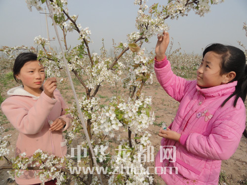 ???????4月12日,商水縣舒莊鄉(xiāng)北王張村的小學生在自家的梨園為梨花授粉。星期天,該村的小學生紛紛跑到梨園欣賞盛開的梨花,幫助家長為梨花授粉,享受著在梨花中勞動的樂趣。