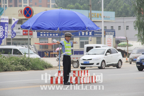 “天再熱,我們也要把交通指揮好?!?月22日12時(shí)30分,在中州大道寧洛高速路口附近,正在指揮交通的交警劉保兵對(duì)記者說(shuō)。記者看到,汗水已經(jīng)浸透了他的衣背,藍(lán)色的制服由淺變深。