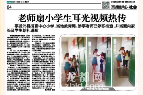 在等待調(diào)查結(jié)果的同時(shí),記者通過網(wǎng)絡(luò)積極尋找與該視頻相關(guān)的信息。9月12日17時(shí)許,記者在當(dāng)天的《彭城晚報(bào)》上看到一則標(biāo)題為《老師扇小學(xué)生耳光視頻熱傳》的消息,報(bào)紙上刊登的圖片為視頻中的截圖。據(jù)報(bào)道,該事件發(fā)生在江蘇省徐州市沛縣胡寨中心小學(xué)。9月9日7時(shí)30許,胡寨中心小學(xué)老師吳某對沒有完成作業(yè)的3名學(xué)生進(jìn)行體罰,后被人舉報(bào)。目前,涉事學(xué)校和老師已向家長和學(xué)生賠禮道歉。