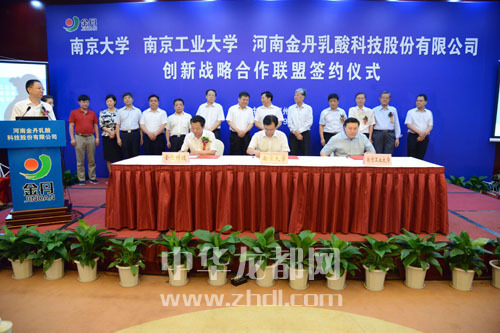 ????本報訊(記者 李莉) 7月9日上午,南京大學(xué)、南京工業(yè)大學(xué)、河南金丹乳酸科技股份有限公司創(chuàng)新戰(zhàn)略合作聯(lián)盟簽約儀式在鄭州舉行。副省長張維寧,中國工程院院士張全興,南京大學(xué)副校長談?wù)苊?,南京工業(yè)大學(xué)副校長喬旭,省科技廳廳長張震宇,市委書記、市人大常委會主任徐光,省環(huán)保廳副廳長師偉,市委常委、常務(wù)副市長劉保倉,市委常委、組織部長靳磊,副市長王田業(yè),及鄲城縣主要領(lǐng)導(dǎo)、河南金丹乳酸公司主要負責(zé)人出席簽約儀式。