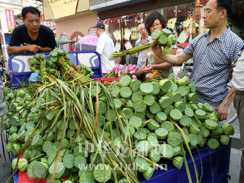????7月25日上午,在周口中心城區(qū)六一路上,一些流動攤販正在販賣荷花、蓮蓬,縷縷清香沁人心脾,引得不少市民爭相購買。晚報記者 朱海龍 攝