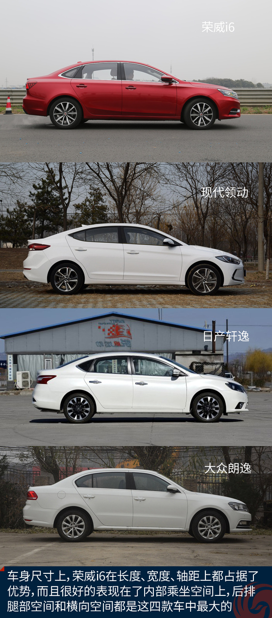 從上面的表格可以看出,榮威i6的長寬高分別為4671*1835*1460mm,在寬度和長度上,都要優(yōu)于其他三款車。特別是車寬,達到了1835mm,橫向的寬度不僅可以提升視覺效果,對車內(nèi)橫向空間也影響很大,尤其是后排乘坐3人的時候。在軸距上,榮威i6以2715mm的數(shù)據(jù)表現(xiàn),穩(wěn)居第一位。