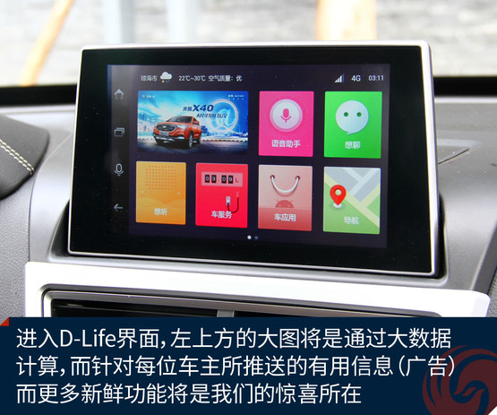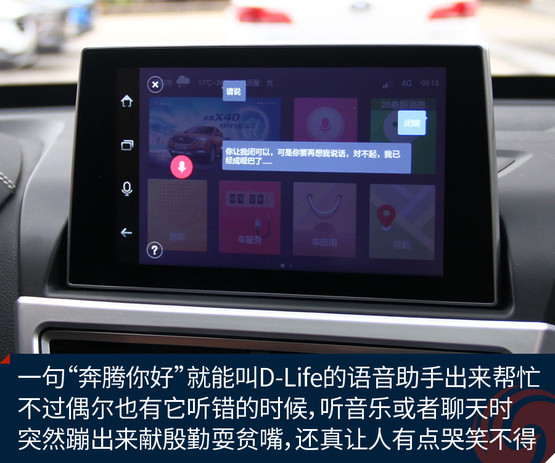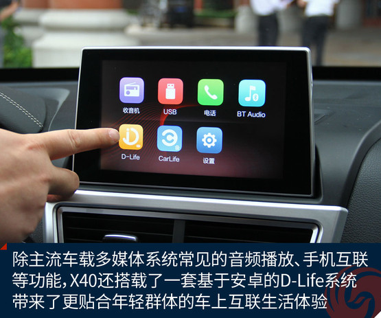 不過跟奔騰X40接觸兩天之后,會發(fā)現(xiàn)它大可不必在對手林立的市場中血拼顏值,靠實力不俗的獨門絕技一樣能夠輕松獲得一席之地。既然面向年輕用戶,豐富的車載娛樂系統(tǒng)很關(guān)鍵。大屏幕、手機互聯(lián)等等似乎已經(jīng)是這類車的標(biāo)配。奔騰X40更進一步,所搭載的D-Life系統(tǒng)讓我們看到了它引領(lǐng)潮流的勁頭。
