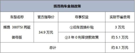 ????????目前購(gòu)買(mǎi)輝昂,可享受首付30%,三年零利率的金融政策,同時(shí)還可以享受3萬(wàn)元置換補(bǔ)貼或者1萬(wàn)元保險(xiǎn)補(bǔ)貼,詳情請(qǐng)見(jiàn)下表: