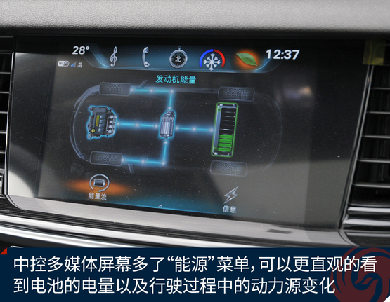 ????????中控多媒體屏幕多了“能源”菜單,點進(jìn)去可以更直觀的看到電池的電量以及行駛過程中的動力源變化。