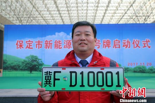 ????中新網(wǎng)保定11月20日電 (呂子豪 于俊亮) 20日,河北省公安廳副廳長劉云峰將冀FD10001新能源汽車專用號牌正式頒給保定市民康辰龍。據(jù)悉,該新能源汽車將享受“不限行”的交通管理優(yōu)惠政策。
