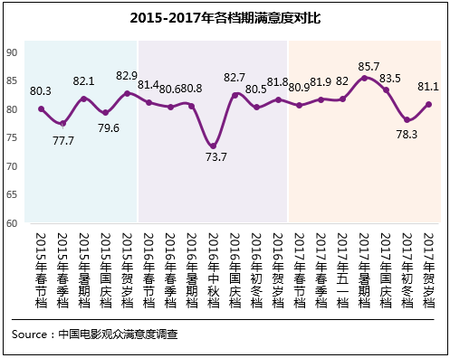 從年內調查的7個檔期來看,除初冬檔以外的其他6個檔期滿意度均進入“滿意”區(qū)間(≥80分),其中暑期檔滿意度得分85.7分,居年內首位,同時也是自滿意度調查開展以來的檔期最高分。另外,2017年檔期滿意度的高點和低點較2015年、2016年均有提升。