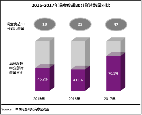 截止賀歲檔,2017年滿意度調查的重點國產片數(shù)量為67部,其中滿意度高于80分的影片數(shù)量為47部,占比超70%;而2015、2016年滿意度超80分的影片總數(shù)為40部,占比僅在40%左右。