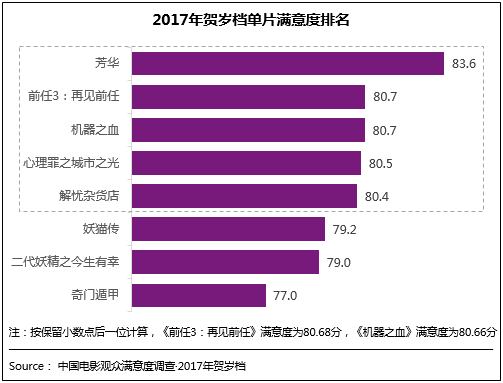 2017年賀歲檔影片獲得了觀眾較好的評價,檔期滿意度得分81.1分,位于歷史調查19個檔期的第十名,居于中段水平。其中檔期觀賞性得分83.1分,思想性得分82.1分,均居于年內第三、歷史第四位的領先水平。