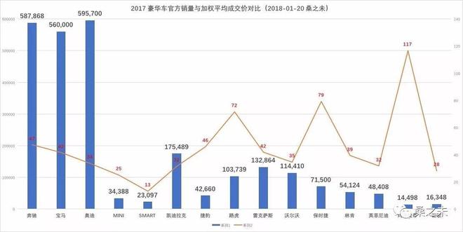 銷售的數(shù)量固然重要,但是銷售質(zhì)量也是評估銷售力不能忽視的重要指標(biāo)。衡量銷售質(zhì)量,“加權(quán)平均成交價”和“單車?yán)麧櫋边@兩個重要參數(shù),也許讓我們更直觀的看到車企的銷售能力與經(jīng)銷商單店經(jīng)營質(zhì)量。這些更微觀的數(shù)據(jù)往往更能反映銷售公司及其經(jīng)銷商體系的銷售能力及水平?!凹訖?quán)平均成交價”反映車企的產(chǎn)品力與銷售公司的銷售能力,車企賣掉的車越多,單車價格越貴,品牌就越具有競爭力,反之就需要考慮改進(jìn)產(chǎn)品,提升銷售管理能力。“單車?yán)麧櫋敝附?jīng)銷商銷售新車獲取的利潤,不含衍生利潤,一般在-4%-7%之間,如果單車?yán)麧櫝^-2%,廠家需要考慮對經(jīng)銷商進(jìn)行補(bǔ)貼,如果利潤超過7%,車企就會調(diào)整經(jīng)銷商浮動返利。下面我們通過這兩個指標(biāo),來看哪些豪華車品牌在2017年表現(xiàn)更具實力。