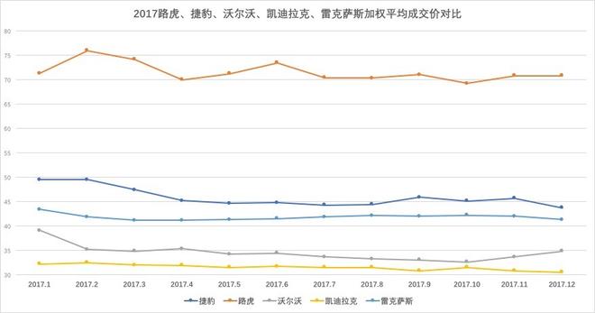 凱迪拉克、捷豹路虎、雷克薩斯、沃爾沃四個品牌銷量在10萬輛以上為第二陣營。除路虎外,捷豹因進(jìn)口F-pace帶動其成交價上揚(yáng),隨著XE國產(chǎn)上市銷售,捷豹銷量有望進(jìn)一步增長,價格進(jìn)一步下探;以銷售進(jìn)口車型為主的雷克薩斯,今年銷量質(zhì)量不錯,庫存時間短,資金周轉(zhuǎn)快,多數(shù)以訂單方式銷售,加權(quán)平均價在42萬上下,成交價格走勢平穩(wěn),經(jīng)銷商今年利潤也很豐厚。沃爾沃在新款車型的帶動下,成交價格開始上揚(yáng);凱迪拉克今年銷量增速較快,通過下圖我們可以看到,凱迪拉克基本依靠低價獲取銷量的增長,成交價格進(jìn)一步走低,經(jīng)銷商的利潤需要依靠廠家補(bǔ)貼。