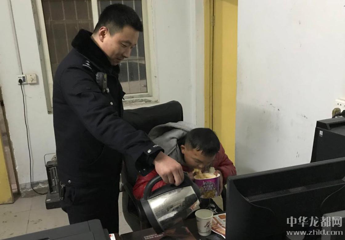 1月25日晚10時許,雪一直在下。扶溝縣公安局柴崗派出所接到群眾報(bào)警稱,在柴崗鄉(xiāng)前楊路段,一名20歲左右的男孩在路旁雪堆里坐著,疑似精神異常。接到報(bào)警后,值班民警郭晨航帶領(lǐng)輔警宋紹帥迅速趕到現(xiàn)場。發(fā)現(xiàn)路邊男孩衣著單薄,凍得瑟瑟發(fā)抖,已說不出話來。民警趕緊把男孩扶上車到派出所。民警先給男孩倒了一杯熱茶,然后詢問他家的情況。男孩只能進(jìn)行簡單的溝通,說不出自己的姓名和家庭住址,只說餓。民警一邊趕忙拿來泡面、火腿腸讓男孩吃,一邊到男孩經(jīng)過的路口調(diào)查走訪,并通過微信朋友圈發(fā)布尋找男孩親人的消息,并附上男孩的照片。