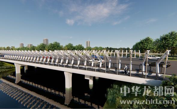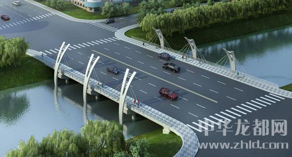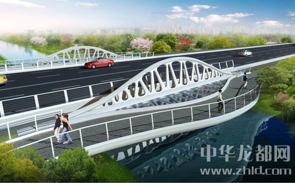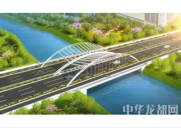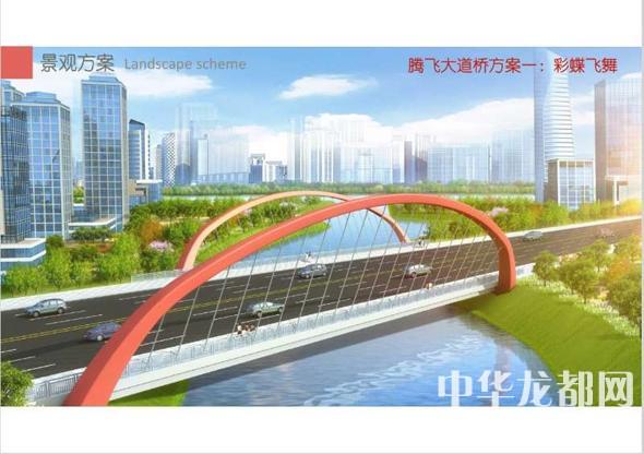 騰飛大道橋的設計方案有兩套,分別為“彩蝶飛舞”和“雙鳳呈祥”?!安实w舞”為下承式鋼管拱橋,寬36米。記者從效果圖中看到,橋兩側(cè)的拱圈,極具色彩感,給人一種賞心悅目的感覺?!半p鳳呈祥”為裝飾鋼管拱橋,寬36米。該橋采用“雙鳳”造型,象征天下太平,富含吉祥之意。