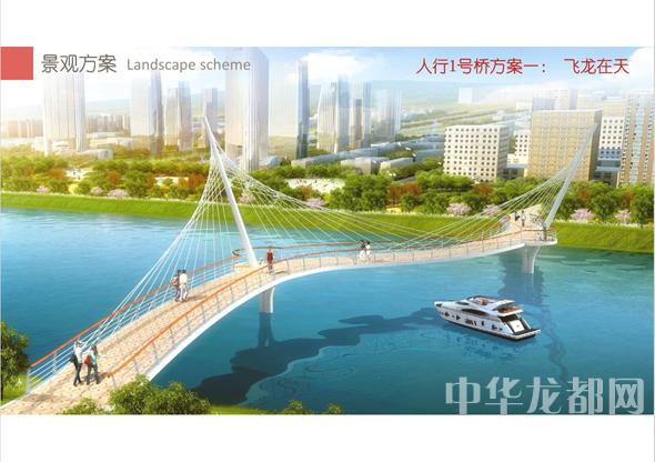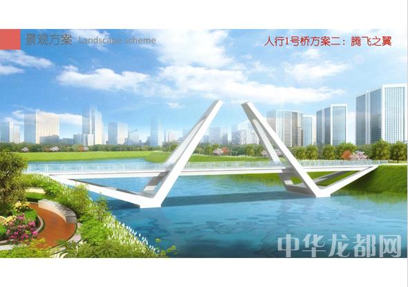 人行1號橋的設計方案有兩套,分別為“飛龍在天”和“騰飛之翼”?!帮w龍在天”為雙塔斜拉橋。記者從效果圖中看到,該橋呈現(xiàn)出優(yōu)美的線條,宛如一條長龍騰空在天?!膀v飛之翼”為V腿連續(xù)鋼箱梁橋。記者從效果圖中看到,橋體簡潔流暢,時尚現(xiàn)代,橋墩形成穩(wěn)固的三角形,像兩只燕子展翅高飛。