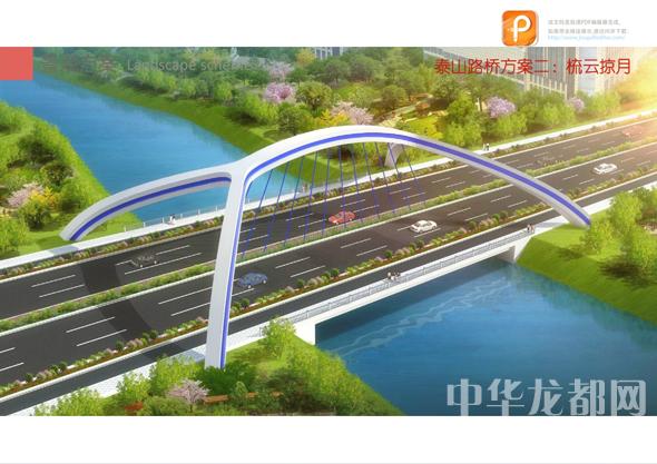 泰山路橋的設計方案有兩套,分別為“錚錚鐵骨”和“梳云掠月”?!板P錚鐵骨”為下承式系桿拱橋。記者從效果圖中看到,其拱體骨架給人一種力量感,拱身視線通透,簡潔明快?!笆嵩坡釉隆睘殇摻罨炷撂峄@拱橋。記者從效果圖中看到,該橋的拱圈造型獨特,簡潔又不失大氣。