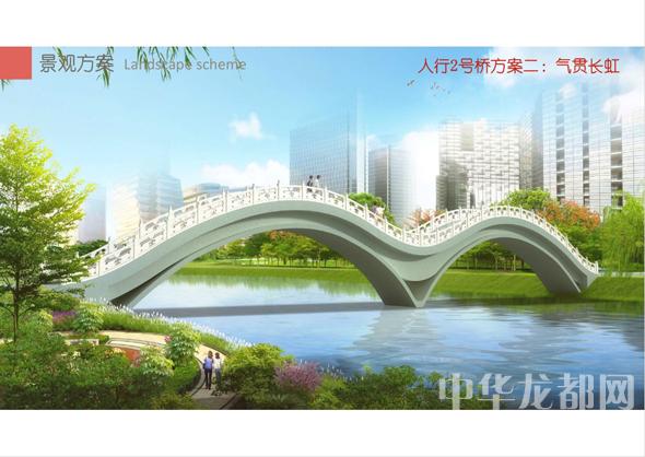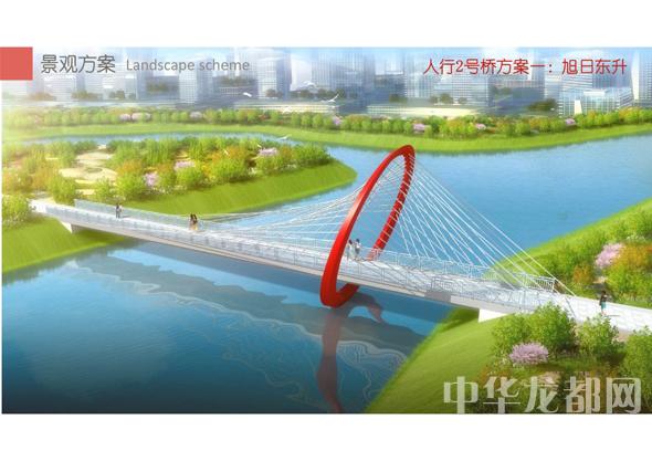 人行2號橋的設計方案有兩套,分別為“旭日東升”和“氣貫長虹”?!靶袢諙|升”為圓形塔懸索橋。記者從效果圖中看到,該橋的橋塔為圓形,猶如一輪東升的太陽,象征著城鄉(xiāng)一體化示范區(qū)蓬勃發(fā)展的未來?!皻庳為L虹”為中承式系桿拱橋。該方案結(jié)合中國玉帶橋的古典元素、抽象古典幾何美學,采用現(xiàn)代的設計手法,創(chuàng)作出現(xiàn)代感和中國傳統(tǒng)橋梁元素雜糅的橋梁設計。