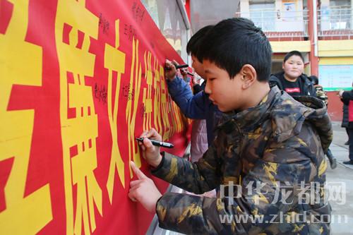 中華龍都網訊(周口報業(yè)全媒體記者 韋偉 通訊員 王佳佳 辛曼 攝)今年是毛澤東“向雷鋒同志學習”題詞55周年。3月5月,沈丘縣紀委監(jiān)委聯(lián)合縣義工聯(lián)走進沈丘二高、河南小學,開展“孝廉文化進校園”活動,旨在弘揚雷鋒精神和“孝善儉廉”的美德。圖為:學生們在“弘揚雷鋒精神,做‘孝善儉廉’美德少年”條幅前簽字。