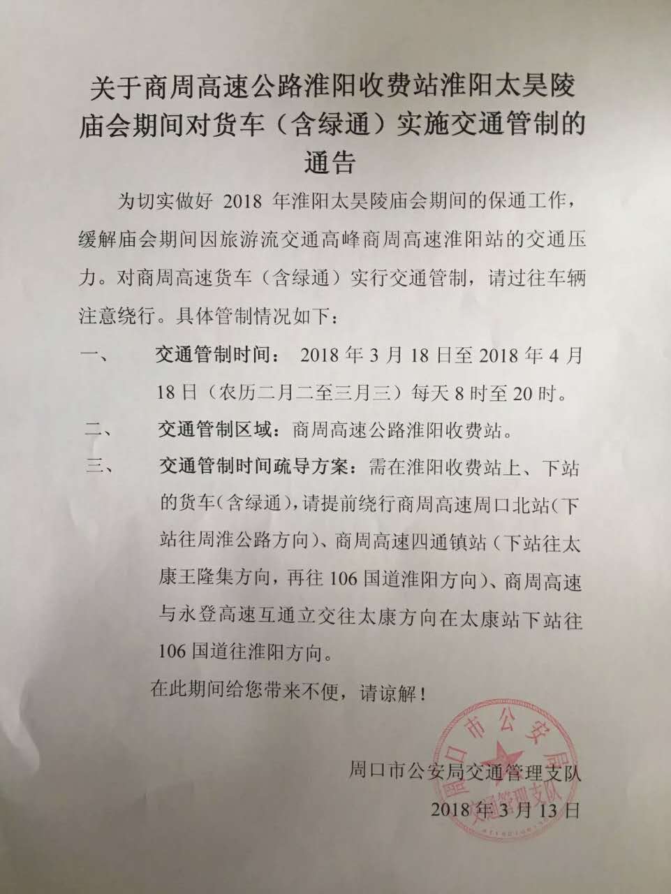 中華龍都網(wǎng)訊(周口報(bào)業(yè)全媒體記者 侯俊豫)3月13日,市交警支隊(duì)發(fā)布通告稱,為做好2018年太昊陵廟會(huì)期間的保通工作,緩解廟會(huì)期間商周高速淮陽(yáng)站的交通壓力。對(duì)商周高速貨車(含綠通)實(shí)行交通管制,請(qǐng)過(guò)往車輛注意繞行?,F(xiàn)對(duì)商周高速貨車(含綠通)實(shí)行交通管制: