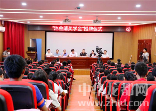 中華龍都網(wǎng)訊(周口報(bào)業(yè)全媒體記者李瑞才 通訊員 郭中華 寧高明)致富不忘桑梓,設(shè)獎(jiǎng)回饋母?!?月18日下午,“池金清獎(jiǎng)學(xué)金”授牌儀式在鹿邑二高舉行。鹿邑縣金輝名酒貨倉(cāng)董事長(zhǎng)池金清、鹿邑縣教體局局長(zhǎng)王振言及全校師生代表300多人參加授牌儀式,以對(duì)從該校走出去、創(chuàng)業(yè)有成并設(shè)立獎(jiǎng)學(xué)金回饋母校學(xué)子的池金清先生的義舉表示感謝。