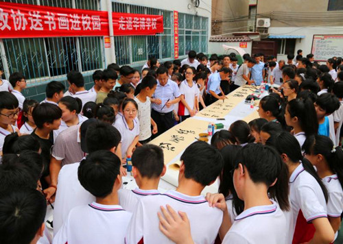 書畫家于連河、岳新華、夏有慶、王廣峰等人現(xiàn)場為師生書寫字畫近千幅,學生們圍在寫臺邊一邊求字畫一邊欣賞書畫技藝。“我們組織書畫家、藝術家到人民中去,為群眾送去藝術享受和書面精品,把精神食糧送給人民?!笨h文聯(lián)主席王亞飛告訴記者。