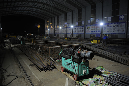 當(dāng)晚21時許,記者在泰和家園施工現(xiàn)場看到,鋼筋加工棚的工人們正在進(jìn)行鋼筋的切割,他們在為明天施工準(zhǔn)備鋼筋材料。A1#樓正在進(jìn)行墊層的澆筑工作,A8#樓正在進(jìn)行負(fù)一層及周邊地庫的鋼筋綁扎及模板加固工作,A9#樓正在進(jìn)行負(fù)一層墻柱鋼筋及模板內(nèi)架搭設(shè)工作?,F(xiàn)場2臺鋼筋切割機(jī)在不停地運(yùn)轉(zhuǎn),9臺塔吊在持續(xù)工作,40余名施工人員在場地內(nèi)各司其職,緊張而有序地趕進(jìn)度,整個施工現(xiàn)場如火如荼。