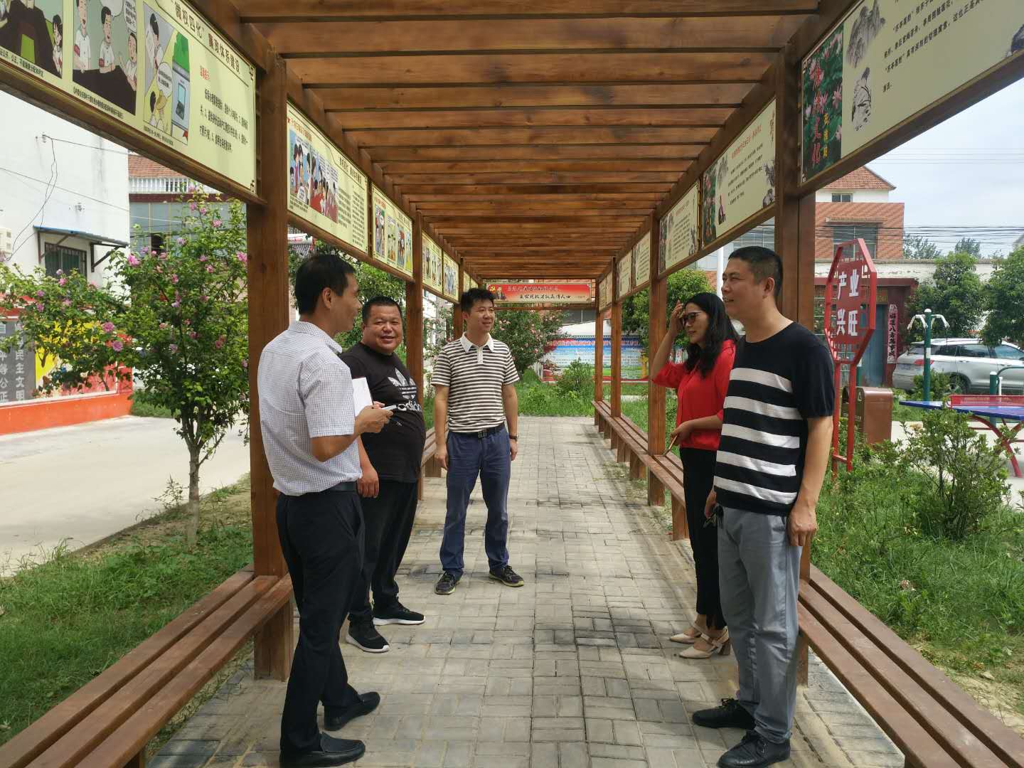一條干凈的水泥路從村子中間橫穿而過,路兩側(cè)和村民房前屋后的大葉女貞流綠滴翠,木槿花開正盛,花朵壓彎了枝條,一面面文明禮讓、孝親敬老、鄰里和睦、移風(fēng)易俗、反腐倡廉的文化墻,畫面生動、形象,讓人忍不著駐足觀看,社會主義核心價值觀宣傳處處可見。