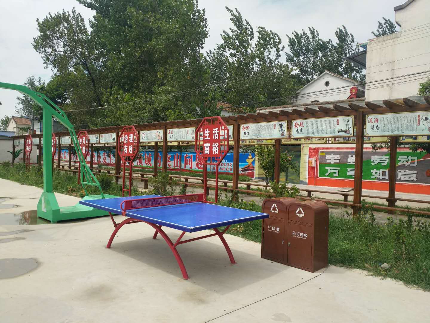 在近2000平方米的文化廣場上,南側(cè)聳立著高高的旗桿,上方五星紅旗迎風(fēng)飄揚;北側(cè)一字排開牽引器、漫步機(jī)、 健騎機(jī)、扭腰器等健身器材,五六位鶴發(fā)童顏的老年人正樂呵呵地鍛煉;東側(cè)設(shè)立的籃球架、乒乓球臺正等待放學(xué)的孩子前來玩耍;西側(cè)新設(shè)的木排廊成了村民休閑聊天的好去處。村黨支部書記郝道杰稱,前一段,有村民提出,健身后累了缺少休息的地方。在征求群眾意見的基礎(chǔ)上,他們設(shè)置了這個木質(zhì)排廊。