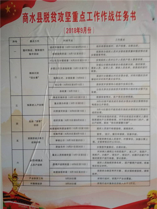 “‘脫貧攻堅重點工作作戰(zhàn)任務(wù)書’既是作戰(zhàn)圖、也是軍令狀,每個時間點開展哪些工作、達(dá)到什么效果、采取何種措施,都在‘作戰(zhàn)任務(wù)書’上顯現(xiàn)了出來。”9月5日上午,商水縣練集鎮(zhèn)朱集村脫貧責(zé)任組組長陳書敬指著張貼在村辦公室內(nèi)的“商水縣脫貧攻堅重點工作作戰(zhàn)任務(wù)書”說。