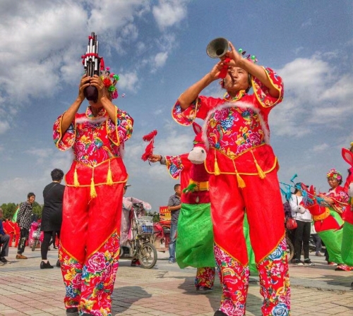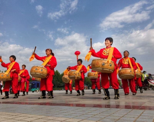 廣場上,一排排碩大的紅氫氣球高懸,氣球下縣掛著祝賀農(nóng)民豐收節(jié)的標(biāo)語。穿著各種鮮艷顏色的表演服裝的民間藝術(shù)表演隊,給節(jié)日增光添彩,擂響盤鼓,為節(jié)日助威。從全縣23個鄉(xiāng)鎮(zhèn)起早趕來的46支民間藝術(shù)表演隊伍,伴隨著悠揚的音樂,喧天的鑼鼓在廣場上各顯其能。腰鼓、盤鼓、耍獅子、劃旱船、抬花轎、挑花籃、廣場舞也以不同的方式表達(dá)著豐收的喜悅。