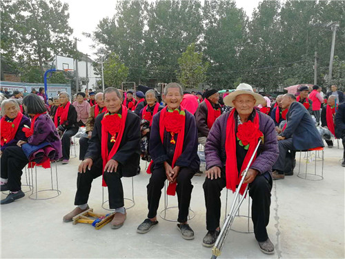 當天下午,洼趙村文化廣場充滿了溫暖和感動:志愿者們早早地為老人們準備了凳子,80名老人在子女的陪伴下,戴上大紅花,身披紅圍巾,津津有味地欣賞著戲曲。