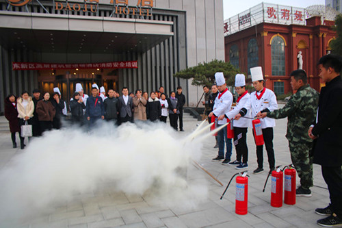在培訓(xùn)現(xiàn)場,為更好地將學(xué)到的知識與實(shí)踐相結(jié)合,大隊(duì)宣傳人員組織參訓(xùn)人員開展了實(shí)地滅火消防演練,酒店全體員工分批次輪番上陣,通過使用滅火器及時(shí)迅速地?fù)錅缁馂?zāi)操練,提高參訓(xùn)人員正確規(guī)范使用滅火器材的能力,達(dá)到了良好效果。