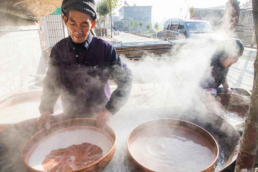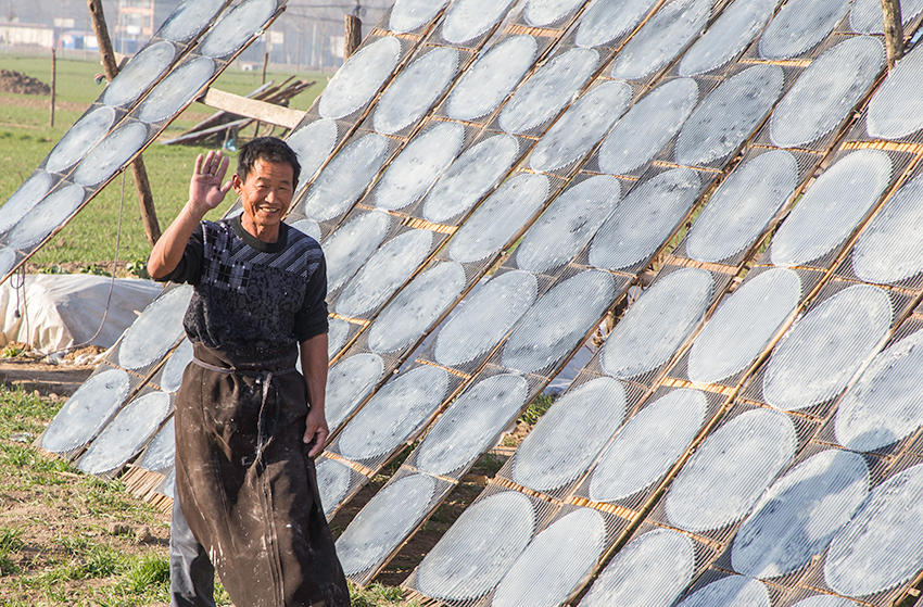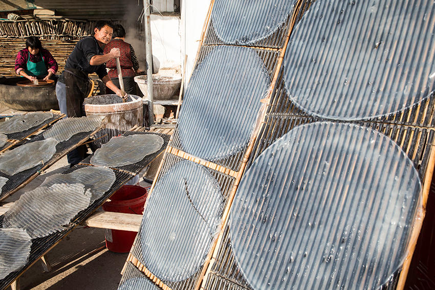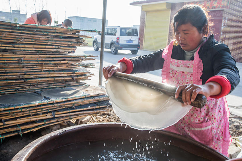 該村地處豫皖兩省交界處,是一個聞名遐邇的粉皮加工專業(yè)村。村里人手工做粉皮已有近百年歷史,從事粉皮加工的村民達(dá)500多人。 來到這里,您可以看到手工做粉皮的全過程。(王天定文/圖)