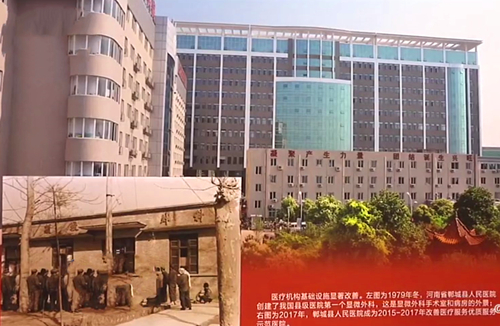 河南電視臺記者陳貞君在展覽板前介紹,這里是位于第四展區(qū)的兩幅同一所醫(yī)院的照片——河南省鄲城縣人民醫(yī)院,這張是1979年冬天,鄲城縣人民醫(yī)院創(chuàng)建了我國縣級醫(yī)院第一個顯微外科,這就是當(dāng)時的顯微外科的手術(shù)室和病房的外景,這張是2017年的鄲城縣人民醫(yī)院??梢哉f改革開放讓同一所醫(yī)院有了滄海桑田般的變遷。