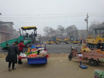 記者今日走訪漢陽路中段(穎河路-建設(shè)路)看到,目前該路段機(jī)動(dòng)車道已鋪上黑色的混凝土物質(zhì),人行道則是壓實(shí)過的土路。壓路機(jī)等設(shè)備??吭诘缆穬深^,并未啟動(dòng),有兩臺(tái)挖掘機(jī)及數(shù)十名工人在人行道上,鋪設(shè)下水道。施工路段內(nèi),有不少菜販在沿街叫賣。