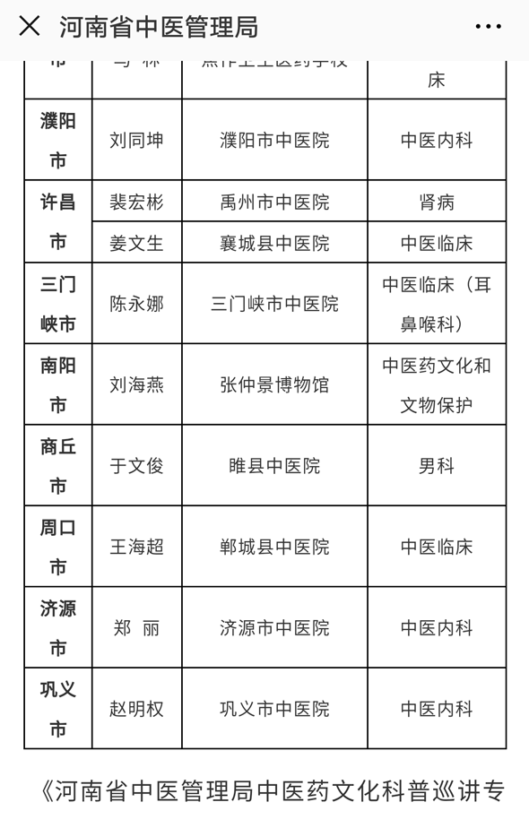 《通知顯示》,為加強全省中醫(yī)藥文化科普人才隊伍建設,經(jīng)培訓考核,張世卿、王海超等34位同志被遴選為第二批河南省中醫(yī)藥文化科普巡講專家,聘期三年。