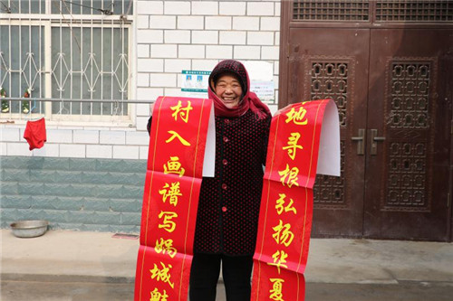 1月16日,西華縣艾崗鄉(xiāng)鐵爐村村民馬永清接過(guò)該縣縣委宣傳部駐村扶貧干部送來(lái)的春聯(lián)喜上眉梢。據(jù)了解,今年春節(jié)前夕,該縣財(cái)政投入200余萬(wàn)元購(gòu)置80萬(wàn)副春聯(lián)在全縣鄉(xiāng)村范圍內(nèi)廣泛開(kāi)展贈(zèng)春聯(lián)、送祝福活動(dòng)。