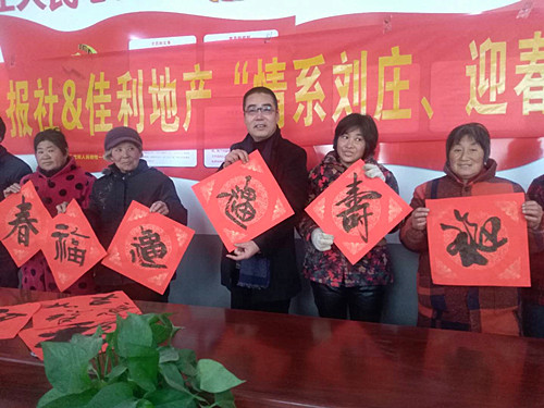1月25日,周口報(bào)業(yè)傳媒集團(tuán)偕愛(ài)心企業(yè)佳利偉業(yè)、周口農(nóng)商銀行,邀請(qǐng)周口藉中國(guó)書(shū)協(xié)會(huì)員靳玉峰、曾祥峰等,來(lái)到淮陽(yáng)馮塘劉莊村,為群眾義寫(xiě)、贈(zèng)送春聯(lián)500多套,村委大院一片歡騰,喜氣洋洋。