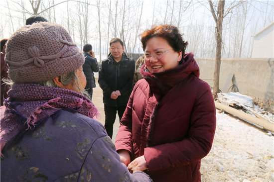 2018年5月11日,張穎波在看望大新鎮(zhèn)陳樓村的困難群眾吳鳳蓮時,曾對她說過一句話,“等你新房蓋好,我再來看你?!保罚稓q的吳鳳蓮把這句話牢牢地記在了心里。一見張穎波的面,拉著手留著淚連聲說:“俺家房早就蓋好了,就一直盼著恁來。我知道恁忙,可就想讓恁看看俺的房……”老人和一位患病的兒子一起生活,去年5月份張穎波來時,她家正因“危房清零”活動而扒掉舊房蓋新房。張穎波當(dāng)時還特意滿足了老人的一個愿望,安排村干部為她家房內(nèi)專門壘個隔斷?!拔遥罚岸嗔耍瑥膩頉]住過這么好的房、從來沒過過這么好的日子!”新建的三間磚瓦房、一間配套齊全的廚房和壘好的院墻讓老人感慨不已,發(fā)自肺腑地說著黨和政府的好?!袄先思?,我今天就是想看看房子改造的怎樣,也給你拜個早年。”張穎波拉著吳鳳蓮老人的手說:“房子蓋好了,也算了了你的一個心愿,有黨和政府的幫助,日子會越來越好。你要照顧好自己和孩子,有啥困難就找村里干部。”