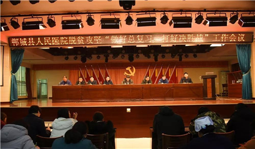 2月15日下午,鄲城縣人民醫(yī)院在門診五樓召開(kāi)脫貧攻堅(jiān)“做好總復(fù)習(xí),打好決勝戰(zhàn)”工作會(huì)議,傳達(dá)落實(shí)縣衛(wèi)計(jì)委扶貧工作會(huì)議精神,部署脫貧攻堅(jiān)工作。鄲城縣人民醫(yī)院院長(zhǎng)于健偕全體院領(lǐng)導(dǎo)班子出席會(huì)議,院黨委書記高飛主持。健康扶貧辦、醫(yī)保、財(cái)務(wù)、宣教、醫(yī)政、護(hù)理、藥事、醫(yī)療裝備等肩負(fù)健康扶貧任務(wù)的職能科室負(fù)責(zé)人、全體護(hù)士長(zhǎng)、3個(gè)幫扶村扶貧隊(duì)長(zhǎng)及全體扶貧隊(duì)員200余人參加會(huì)議。