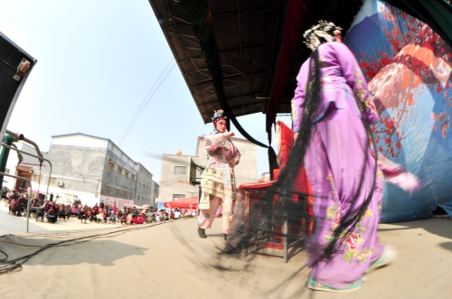 當(dāng)天上午,劇團(tuán)演出的是豫劇《金殿認(rèn)子》,演員們長(zhǎng)年在基層演出,練就一身硬功夫。演員們?cè)谵r(nóng)院內(nèi)化妝,戲服一換,就迅速入戲,生旦凈丑,你來(lái)我往,頗見功底的唱腔及其悠長(zhǎng)的韻味,讓戲迷們看得入迷。