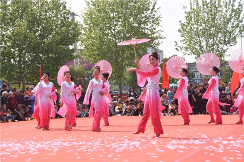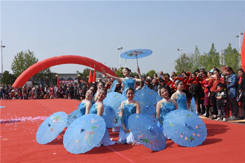 比賽進(jìn)行到將近一半時候,縣第二實(shí)驗(yàn)小學(xué)參賽隊帶來的舞蹈《麗人行韻》將大賽推向了高潮。表演開始,身著天藍(lán)漸變色長裙的38名姑娘手持彩傘一字列隊緩步入場,正當(dāng)觀眾們看得入神時,她們突然將彩傘都齊刷刷地舉過頭頂并瞬間打開,無數(shù)粉紅色的花瓣從彩傘中紛紛飄落,像從碧藍(lán)的天空中下起了無盡的花瓣雨。選手們短短幾秒鐘的舉動,在廣場上勾勒出了一個人間仙境,引人入勝。在粉紅花瓣的映襯中,傘下腳步輕盈的女子們微微舞動,美若天仙,婀娜多姿,展現(xiàn)了“人面桃花相映紅,桃花依舊笑春風(fēng)”的作品主題。