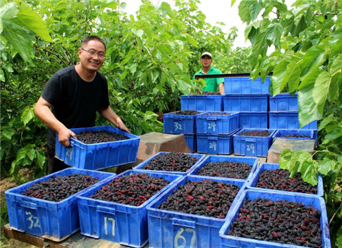除此之外,桑果的采摘全靠人工,是勞動密集型產(chǎn)業(yè),需要大量當(dāng)?shù)氐膭趧恿Γ康讲烧竟?jié),公司都會招用周邊200余名村民到種植基地務(wù)工,僅此一項,為每名務(wù)工人員人均增收3000余元?!鞍吃谝嫫飞i┓N植基地采摘桑椹,每天都有100多元的收入?!苯衲?3歲的黃橋鄉(xiāng)孫堤村留守婦女趙美容高興的說。