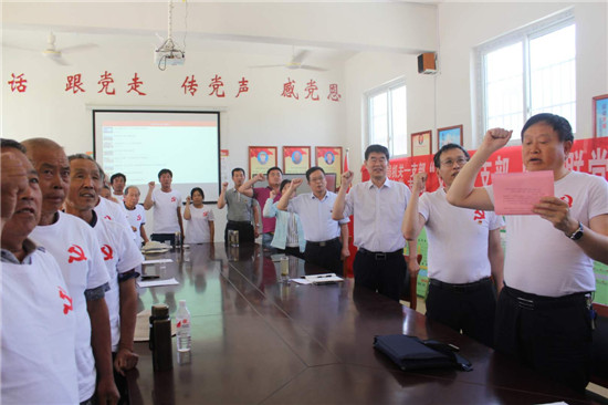 縣教體局黨組書記、局長劉現(xiàn)營,城郊鄉(xiāng)鄉(xiāng)長王忠,縣教體局機關(guān)一支部書記、主任科員張本寶,城郊鄉(xiāng)副鄉(xiāng)長晉惠萍等帶領(lǐng)與會黨員舉起右拳,挺起胸膛,莊嚴宣誓,重溫了入黨誓詞。