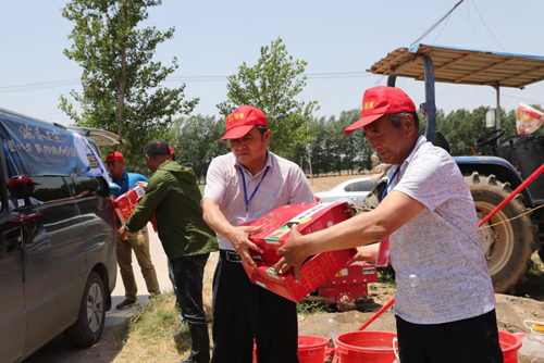 6月4日中午,太康縣委宣傳部常務(wù)副部長趙勇與瀘州老窖(懷舊)公司豫南區(qū)負(fù)責(zé)人劉光軒等工作人員一起,在王集鄉(xiāng)慰問后又不顧炎熱來到了馬廠鎮(zhèn)麥?zhǔn)找痪€,給工作人員送去礦泉水、粽子、牛奶等用品。