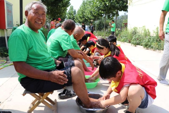 7月的太康,酷熱難耐。6日上午8時(shí)許,一輛公交車穩(wěn)穩(wěn)停靠在太康縣芝麻鄉(xiāng)敬老院門口,車上下來(lái)20多名身穿紅馬甲的學(xué)生志愿者,他們抬著米、面、油和雞蛋等物品走進(jìn)敬老院。坐在門口等候的老人們,樂(lè)呵呵地上前迎接客人。整個(gè)敬老院一下子熱鬧起來(lái)。放下物品,孩子們立馬開(kāi)始勞動(dòng),他們從老人們宿舍搬出馬扎、板凳,在院中擺放安穩(wěn),扶著老人坐上去,開(kāi)始給老人洗腳。正上初中一年級(jí)的李博泉細(xì)心地幫72歲的張照志老人摳掉趾甲縫和腳底的污垢。張老漢流淚了:“這輩子有人給我洗腳,我真是不知道哪修來(lái)的福氣……”